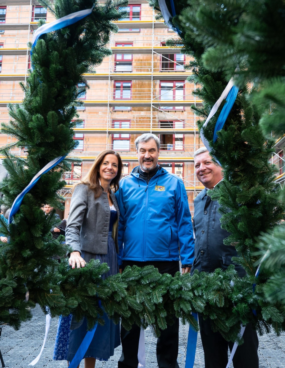Richtfest für 554 bezahlbare Apartments und Familienwohnungen für Polizisten, Justizvollzugsbeamte und andere Staatsbedienstete! Ministerpräsident Dr. Markus Söder, MdL, und Bauminister Christian Bernreiter, MdL, begrüßten dazu die am Projekt beteiligten Handwerker und Planer sowie Vertreter aus Politik und Gesellschaft auf dem Gelände in München Giesing.