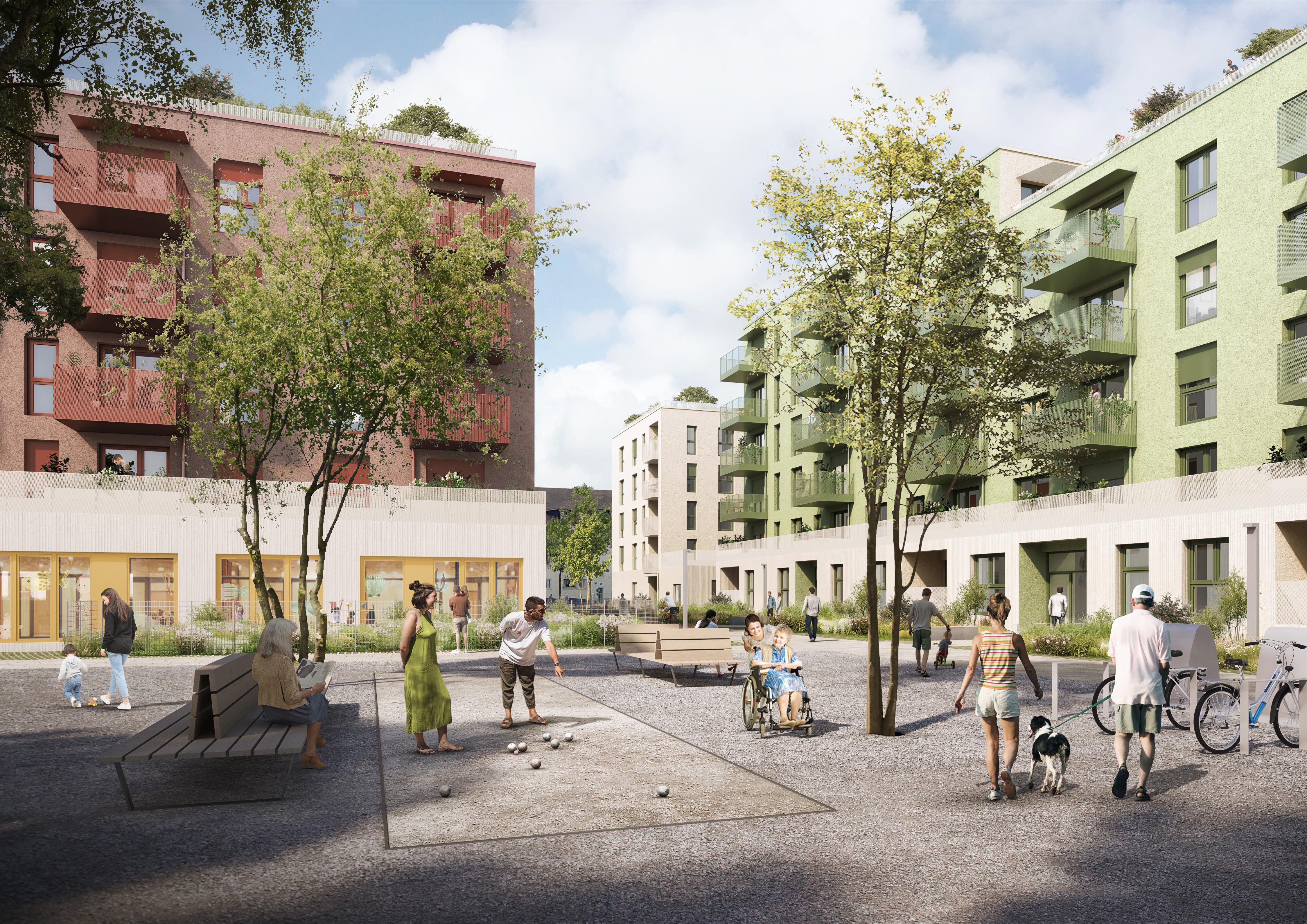 Das neue Quartier nimmt bereits Form an: Zwei Wohnhöfe mit attraktiven Familienwohnungen im Inneren des Quartiers und kleine Apartments im Süden an der Stadelheimer Straße. Hier wird ein neuer großer Supermarkt das Nahversorgungsangebot der Umgebung ergänzen. Drei Kitas werden über das oberirdisch autofreie Quartier verteilt. Kleine urbane Plätze und die grünen Innenhöfe mit großen Bäumen laden die Bewohner zum Aufenthalt ein. Die begrünten Dächer werden gemeinschaftlich durch die Bewohner oder mit Photovoltaik genutzt. Es entsteht rund 25.000 Quadratmeter nachhaltiger Wohnraum für Singles, Paare und Familien mit Kindern. Bauminister Bernreiter: „Der Neubau leistet einen wichtigen Beitrag für mehr bezahlbaren Wohnraum im Münchner Süden: Der Freistaat gibt hier rund 1000 Staatsbediensteten aus Polizei, Justiz und anderen Bereichen sowie ihren Familien eine neue Heimat! Der vielfältige Wohnungsmix verspricht eine ausgewogene Bewohnerstruktur. Gemeinschaftsflächen und abwechslungsreich gestaltete Freibereiche sorgen für ein attraktives Wohnumfeld.“